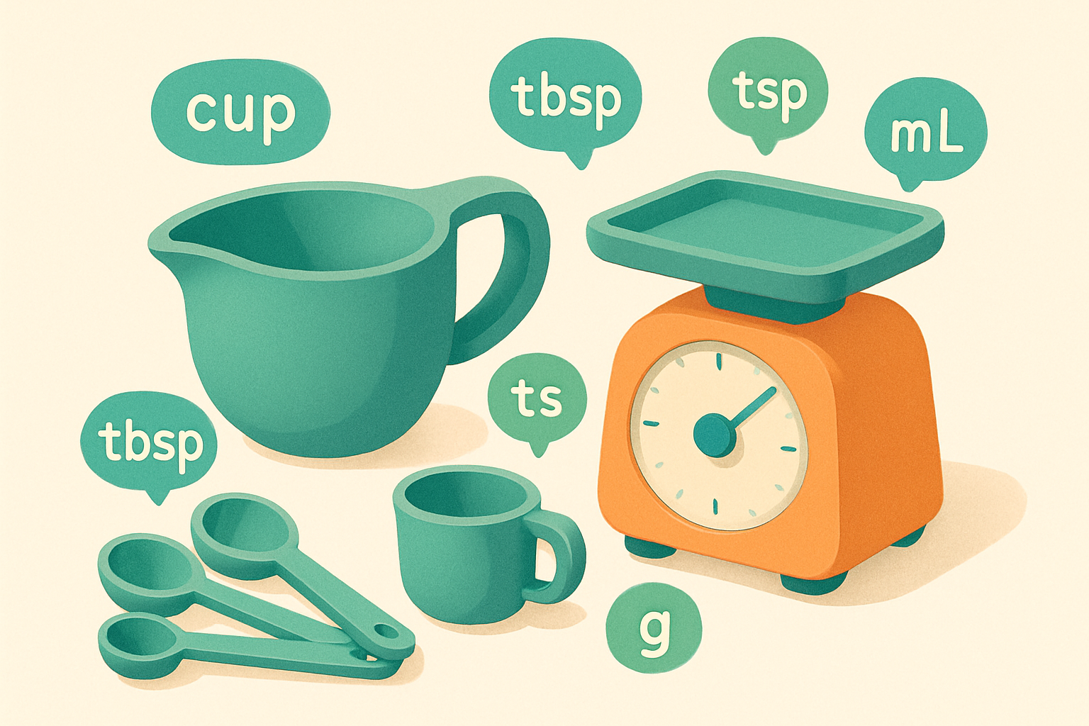 Convert cooking measurements: cups, tablespoons, teaspoons, fluid ounces, milliliters, liters, grams, ounces, and pounds.