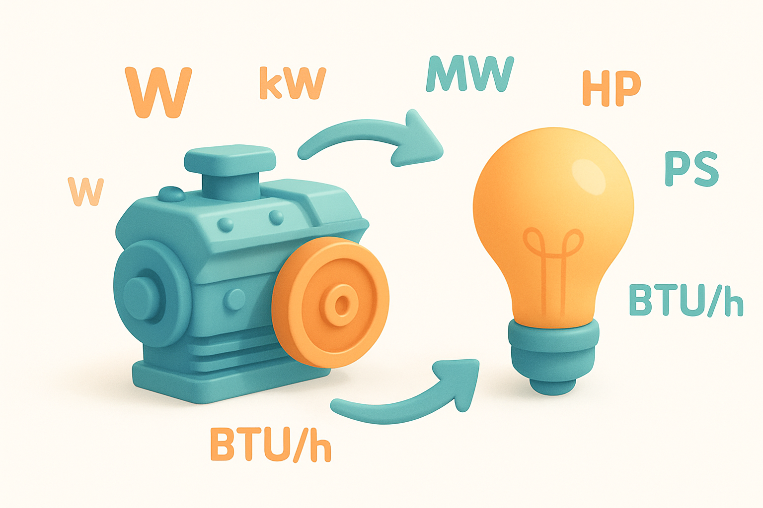 Convert between watts, kilowatts, megawatts, horsepower, PS, BTU/h, and ft-lbf/s.